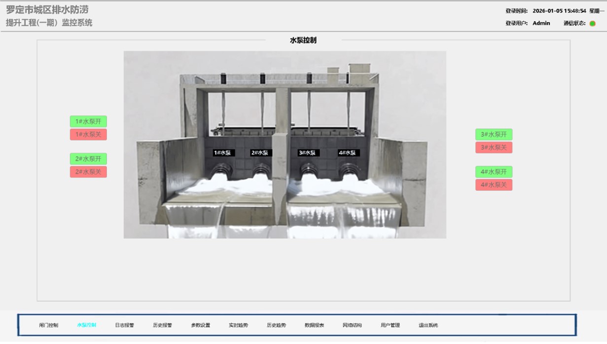 涵闸的防洪排涝系统主要采用一体化泵闸来实现非讯期时,闸门处于全开状态,内外江水位自然流动。当讯期来临时,外江水位升高,这时闸门要降下来处于全关状态,启动水泵,由内向外进行抽水,达到排涝的目的。该一体化泵闸是一种新型的输水截流设备,采用全新的设计理念,以闸门为结构基础,将泵和闸门合二为一,同时配套相关的控制系统,实现河道水位的调节和自动化监控。该系统由工作闸门、潜水泵、启闭机、电气控制系统、液位监测系统及检修闸门、拉污栅等部件组成,广泛应用于河道治理排涝工程。