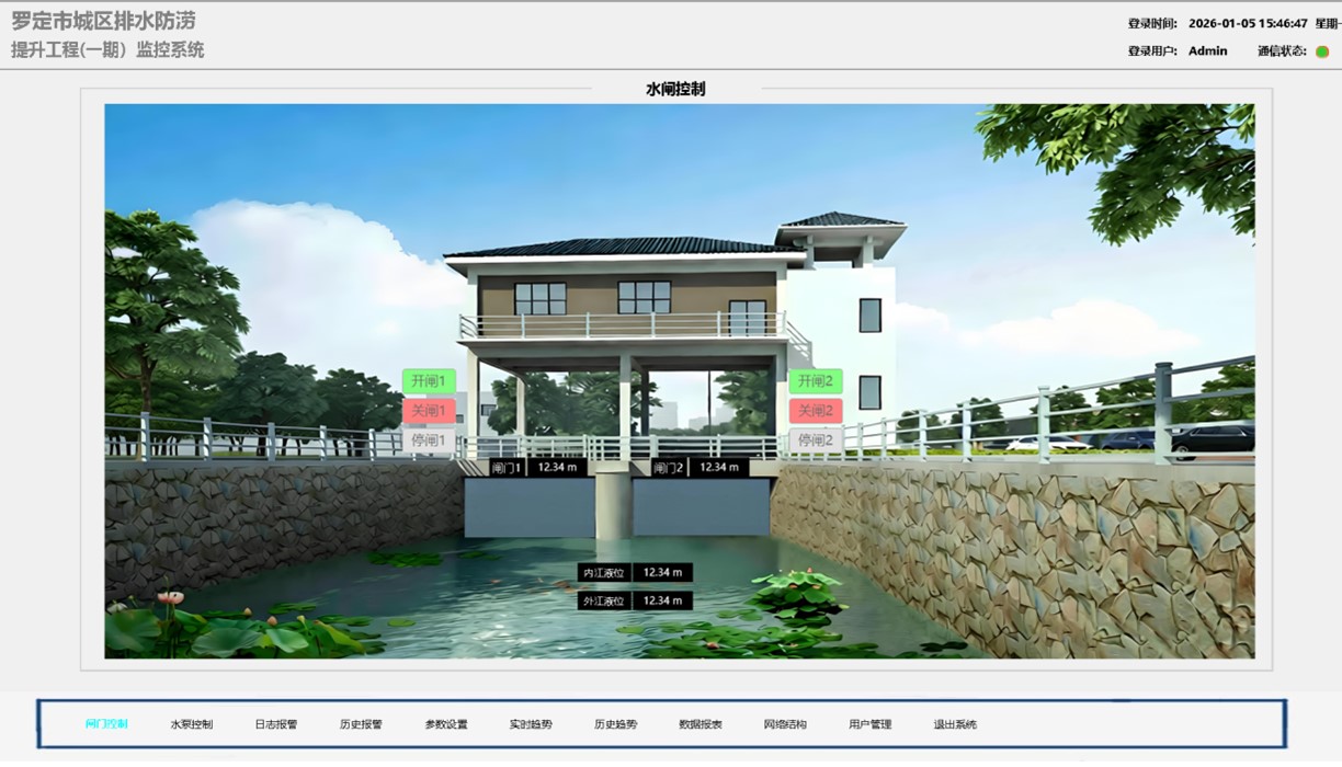 涵闸的防洪排涝系统主要采用一体化泵闸来实现非讯期时,闸门处于全开状态,内外江水位自然流动。当讯期来临时,外江水位升高,这时闸门要降下来处于全关状态,启动水泵,由内向外进行抽水,达到排涝的目的。该一体化泵闸是一种新型的输水截流设备,采用全新的设计理念,以闸门为结构基础,将泵和闸门合二为一,同时配套相关的控制系统,实现河道水位的调节和自动化监控。该系统由工作闸门、潜水泵、启闭机、电气控制系统、液位监测系统及检修闸门、拉污栅等部件组成,广泛应用于河道治理排涝工程。