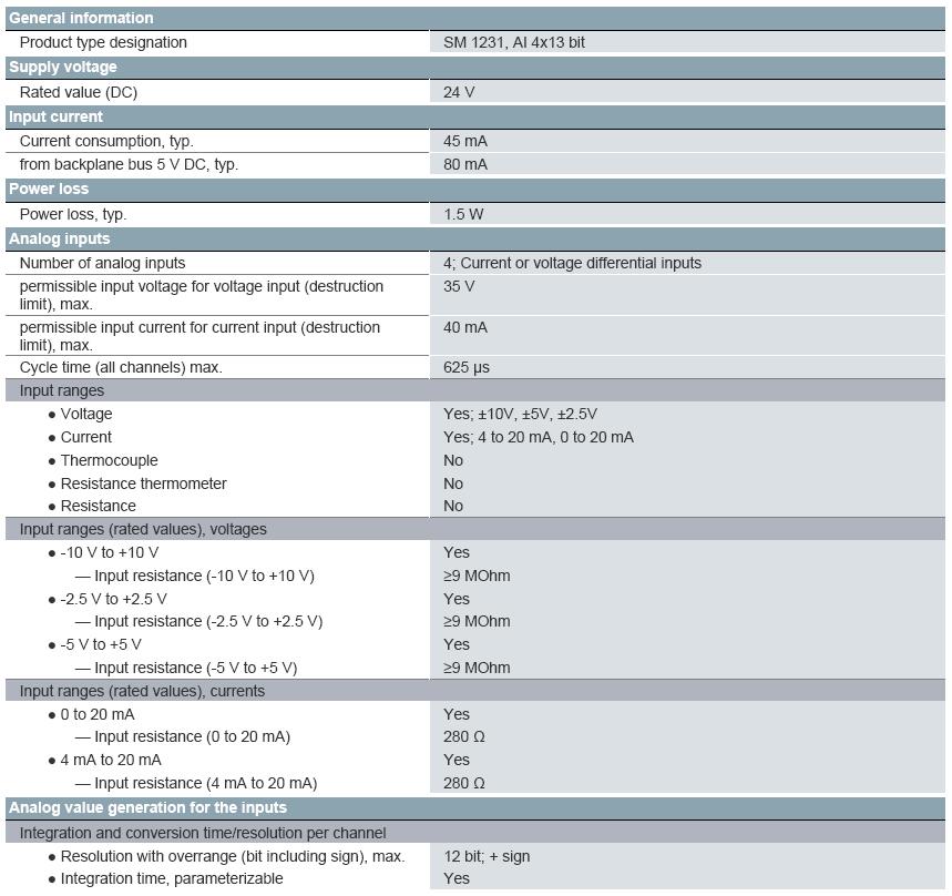 SIMATIC S7-1200, Analog input, SM 1231, 4 AI, +/-10 V, +/-5 V, +/-2.5 V, or 0-20 mA/4-20 mA, 12 bit+sign (13 bit ADC)